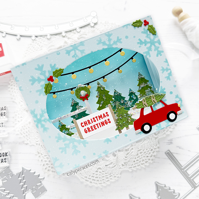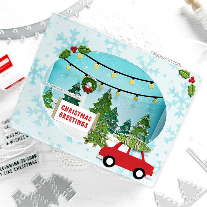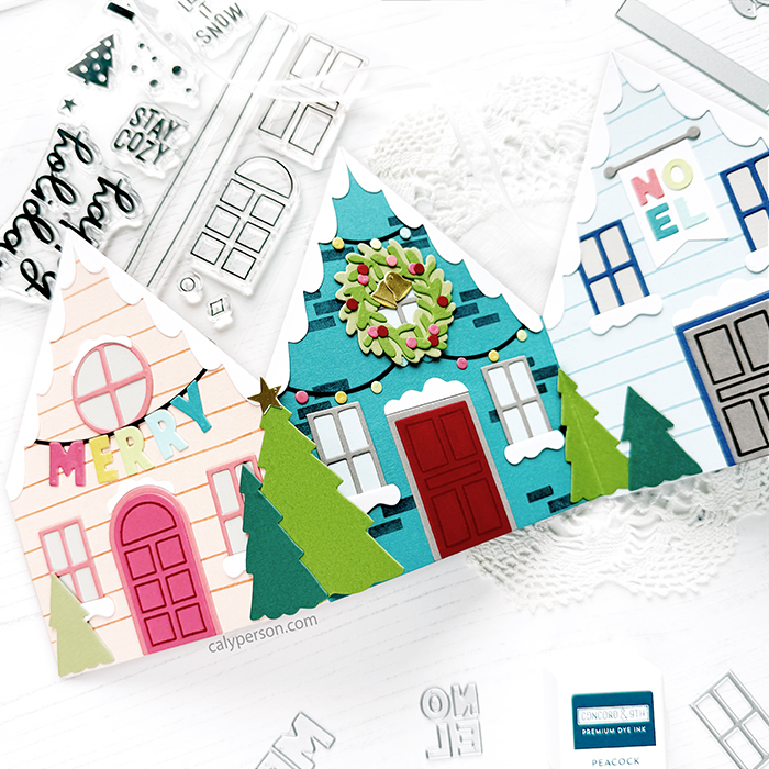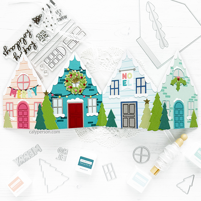 Card size: A2 (4.25″ x 5.5″) *mine is a little wider because I left the trees overhanging as opposed to folding them over. The four houses collapse onto one another perfectly to stack as one.