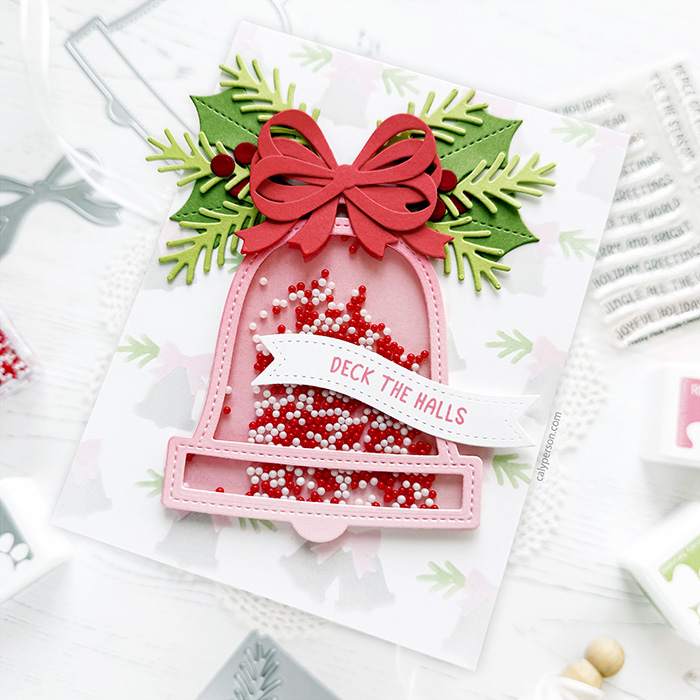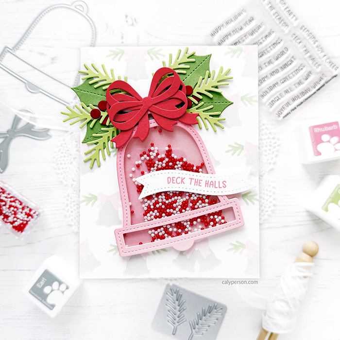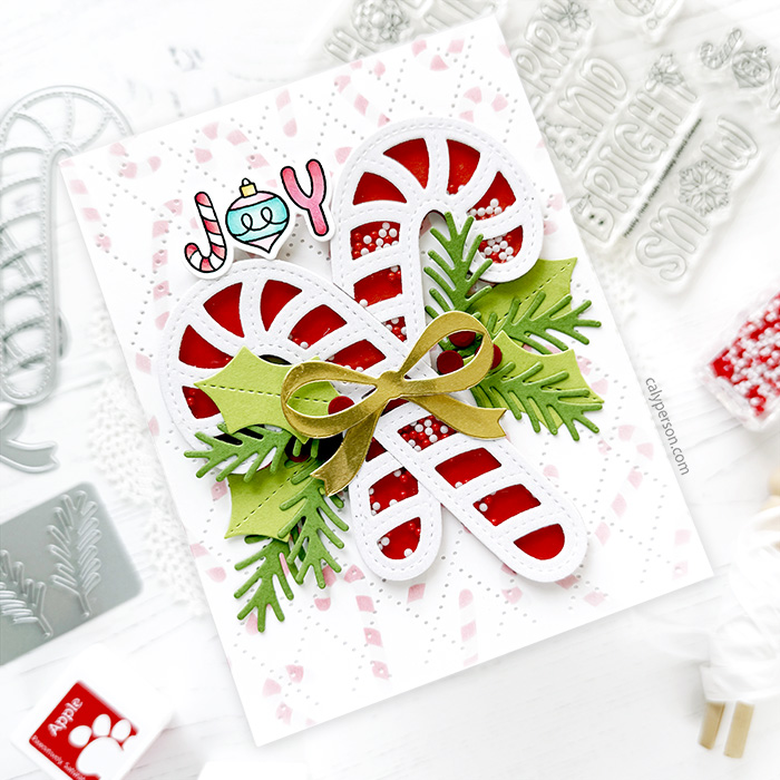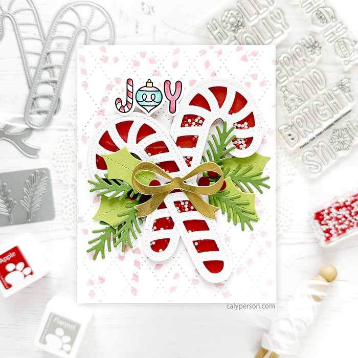 I did some surgery on one of the candy canes to get both to sit flush with each other. The foliage from the Christmas Bell Shaker Dies compliments this design perfectly!