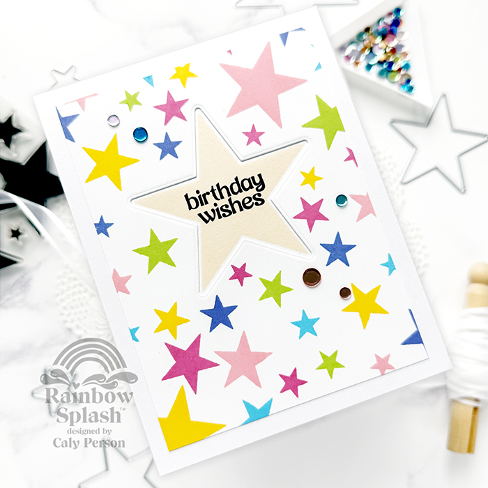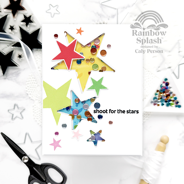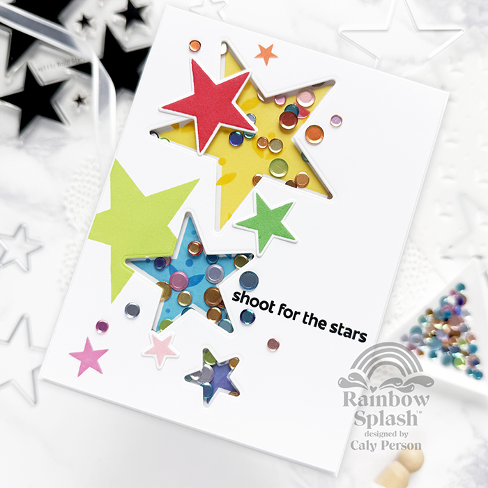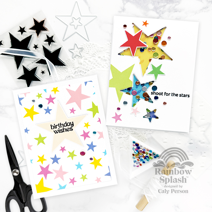Are you ready for another STAMPtember® 2025 surprise? We have a Rainbow Splash release with some awesome products. Rainbow Splash is an exclusive collection from Simon Says Stamp that focuses on simplicity and approachable products. As you can see from the Bold Stars set that I’m featuring today, a simple star stamp set can be used in creative ways to create fun (shaker) and colorful cards! I’ve paired them with other stamp sets from the Rainbow Splash Collection for the sentiments and used new embellishments on each set.