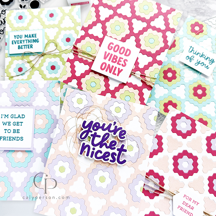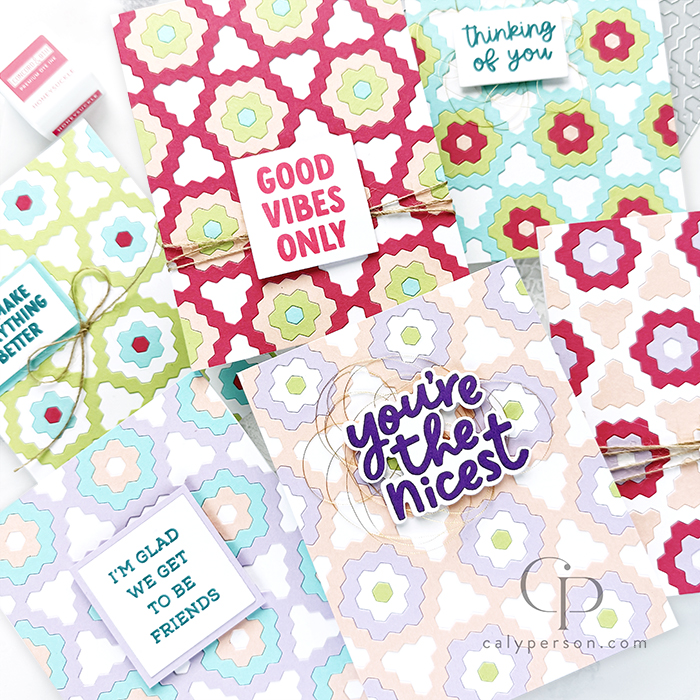 I made several cards using the Concord & 9th Hexie Bloom Inlay Die with ONE color palette. My daughter picked 5 colors (plus white) to die-cut using the Hexie Bloom Inlay Die and with all the pieces, I was able to piece together 6 panels. These make such quick mass produced cards and I didn’t even end up using all the pieces! For the sentiments, I used the Friendly Phrases Bundle and that made these cards the easiest mass-produced cards I’ve ever made!