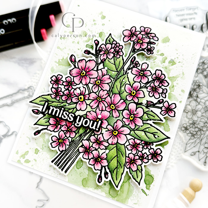 It’s time for a new release from Gina K. Designs! I’m sharing a card using the Forget-Me-Nots set. I stamped the image with black ink and colored with OLO markers. For the background, I added some texture and interest by ink-smooshing with Distress Oxide in Rustic Wilderness. To top it off, I added white paint splatter. I finished my card with an embossed sentiment.
