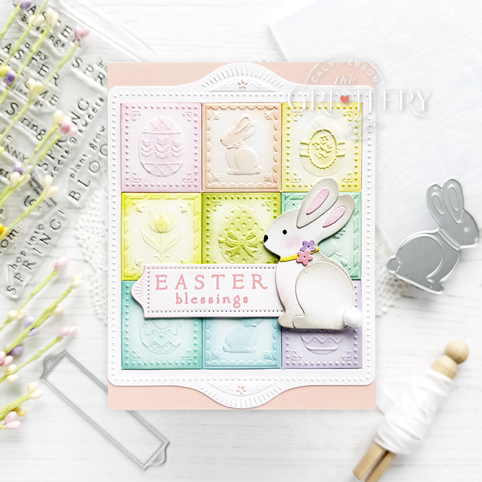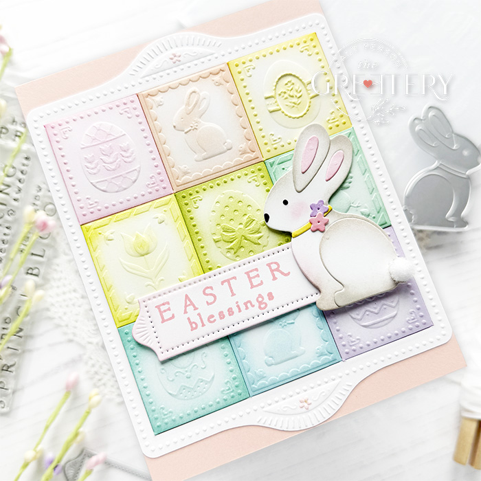 This sweet Easter card also includes a product that will be showcased tomorrow 😉. I embossed the image and snipped everything apart to ink-blend the rainbow of embossed icons. To die-cut the parts, I used the Shortbread Shapes Rectangle Die.