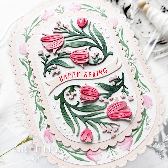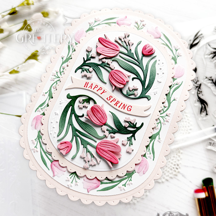 I also embossed the center piece, but used it more as a guide for the Tangled Tulips Details Die. You can see some embossed details on the side of each floral cluster. You’ll need the Capsule Basics Die to create the scalloped borders and oval layers.