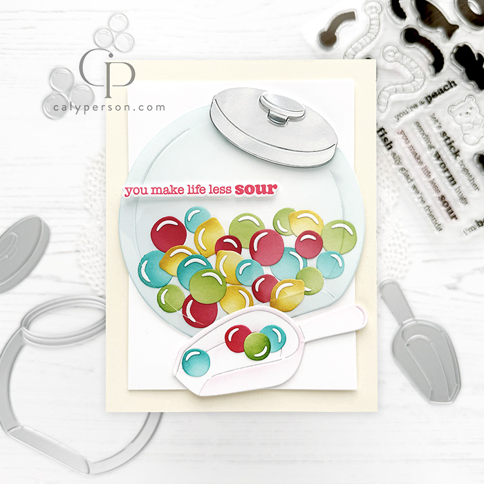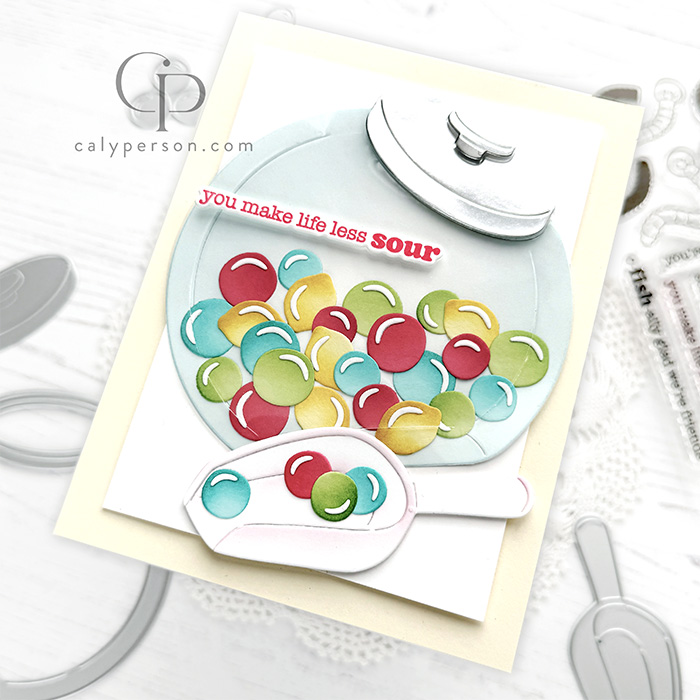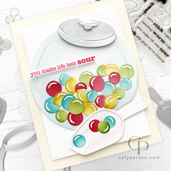 My card today features the Penny Candy Jar Dies – it’s so fun! I used an acetate layer on top to make it look like a glass jar. More details are provided below!
